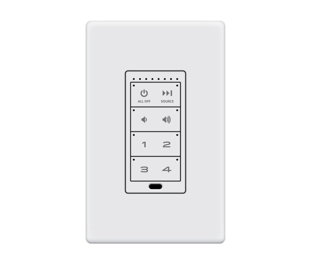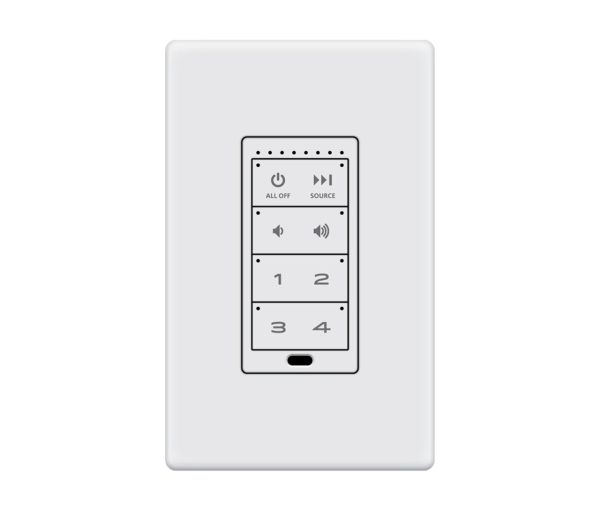 Featuring a sleek, low-profile design, this keypad integrates seamlessly into any wall, providing an intuitive user experience with easy access to volume, source selection, and playback controls.