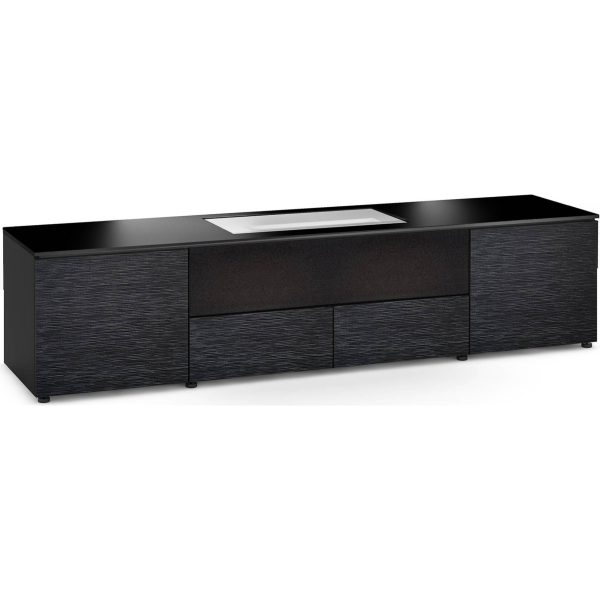 The Salamander Designs Chicago 245 offers a flush top surface with a recessed cavity specifically designed for the LG HU85LA projector. This elegant piece of furniture is not just a cabinet but a statement that complements any decor with its Black Oak finish and Tall Grass Texture & Black Glass top.