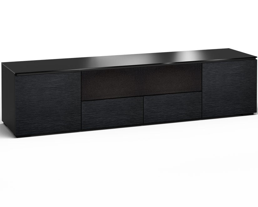 The Chicago 245 is a marvel of design, featuring black low-profile wood feet with hidden levelers for a clean look. Its lightly textured black oak doors open to reveal a generous space tailored for your audio/video needs.