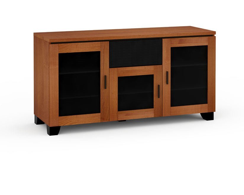 Crafted from the finest materials, including wood, glass, and aluminum, the Elba 336 boasts an alluring American Cherry finish that exudes warmth and character. The wide framed wood doors feature smoked glass inserts that not only enhance its aesthetic appeal but also subtly conceal your high-end audio equipment while still allowing remote control signals to pass through effortlessly.