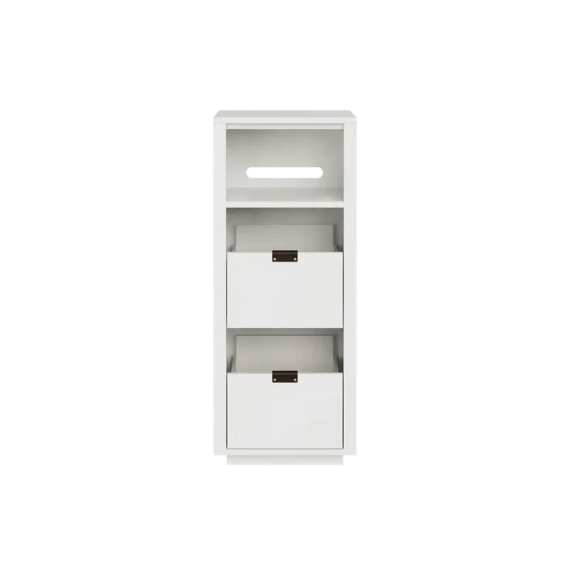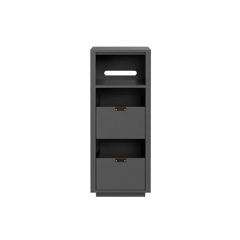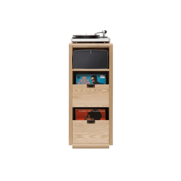 The Dovetail 1×2.5 Record Storage Stand with Sonos Shelf can hold up to 150 records. This simple cabinet allows for easy browsing in a compact, 2-box vertical design with the addition of the Sonos-sized shelf.