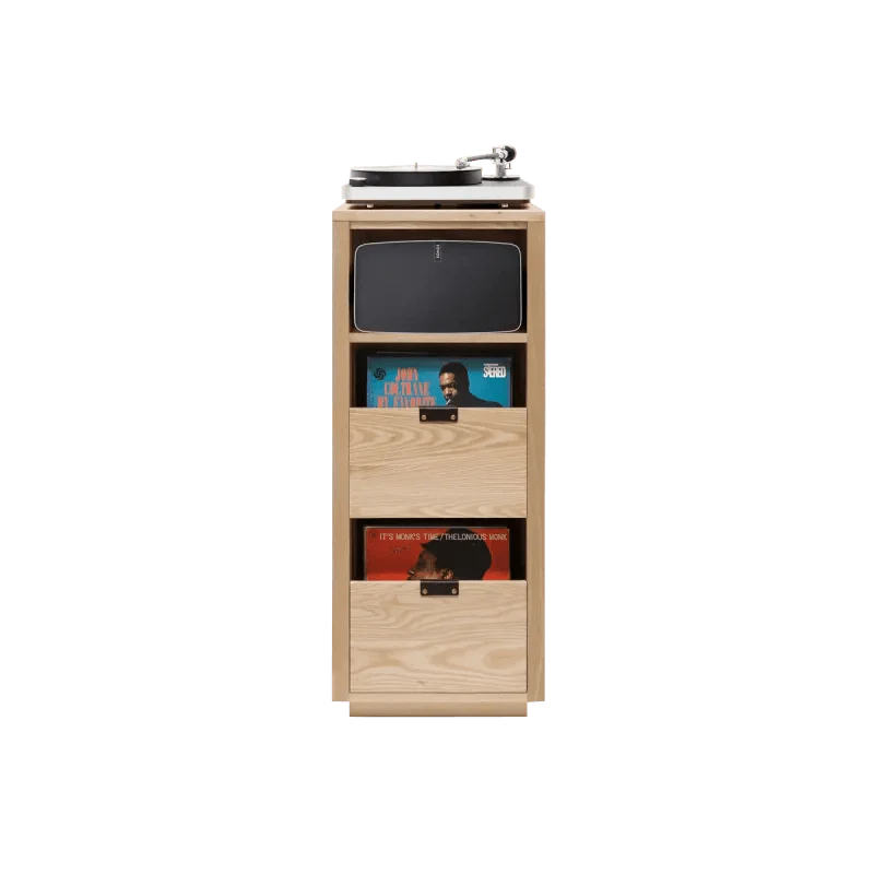 Dovetail displays your album art while storing hundreds of your favorite records. Named after the English “dovetail” joinery used on the LP file drawers, Dovetail features premium details like vegetable-tanned leather handles with solid-brass hardware, and German-made soft-close drawer slides.